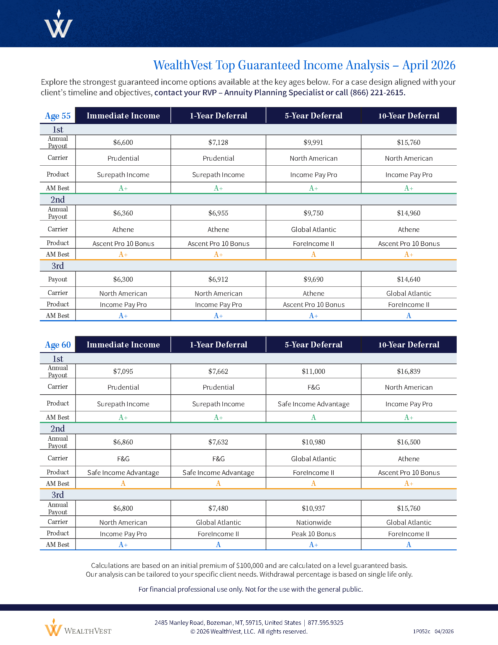 Each week, we analyze the top fixed index annuity crediting strategies, GLWB riders and multi-year guaranteed annuity rates to ensure you’re delivering the best solutions to your clients. Connect with a member of our team below to secure a strategy or rate. Click the button below to see the top FIA rates and top guaranteed GLWB income riders right now from WealthVest.