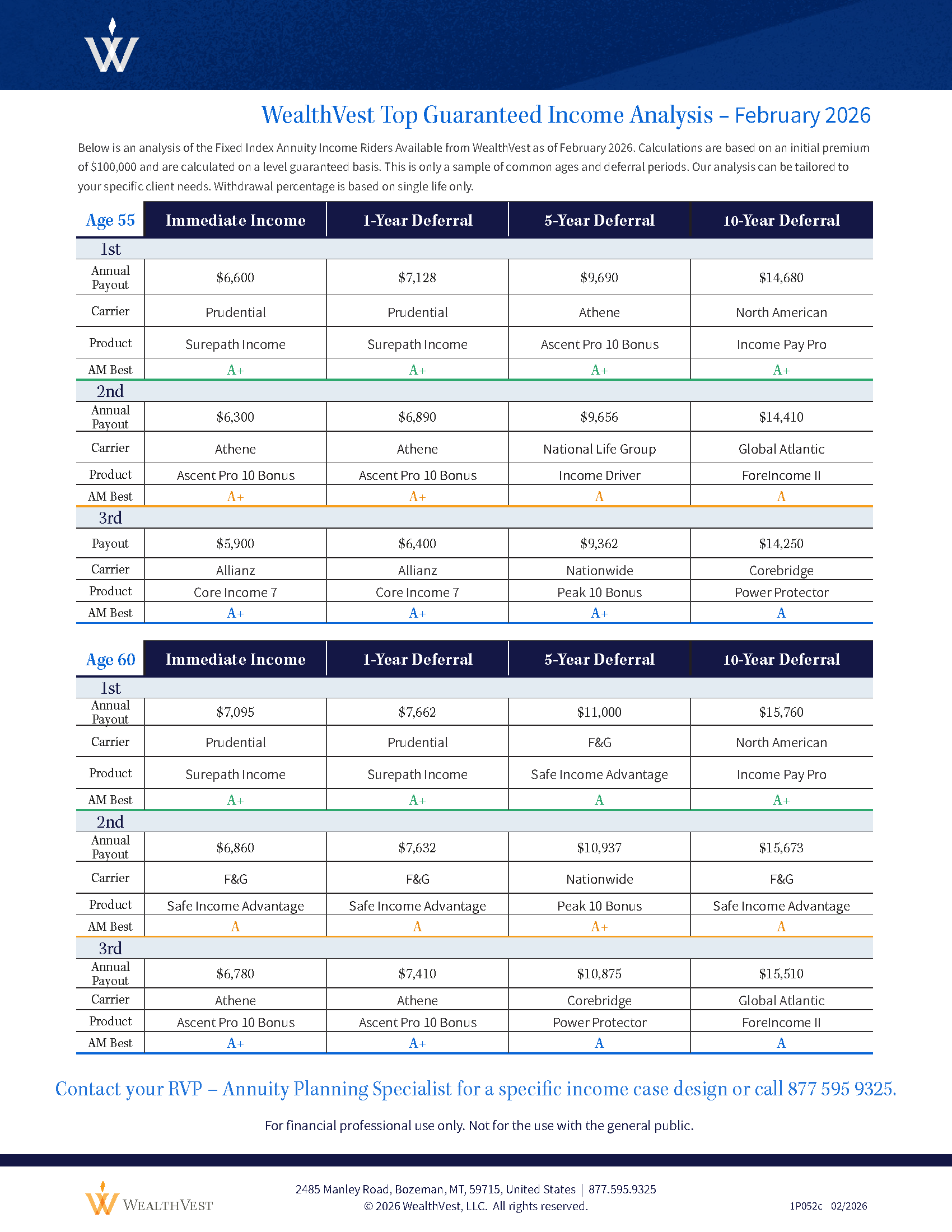 Each week, we analyze the top fixed index annuity crediting strategies and multi-year guaranteed annuity rates to ensure you’re delivering the best solutions to your clients. Connect with a member of our team below to secure a strategy or rate. Click the button below to see the top FIA rates and top guaranteed GLWB income riders right now from WealthVest.